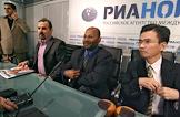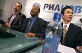 Слева направо: председатель комитета Федерации мигрантов России (ФМР) по бизнесу и экономике Рашид Эль Аараби, президент ФМР Маджумдер Мухаммад Амин и вице-президент ФМР Ле Хай Фонг на пресс-конференции "Федерация мигрантов России о проблеме закрытия Черкизовского рынка". Пресс-конференция прошла в РИА "Новости".