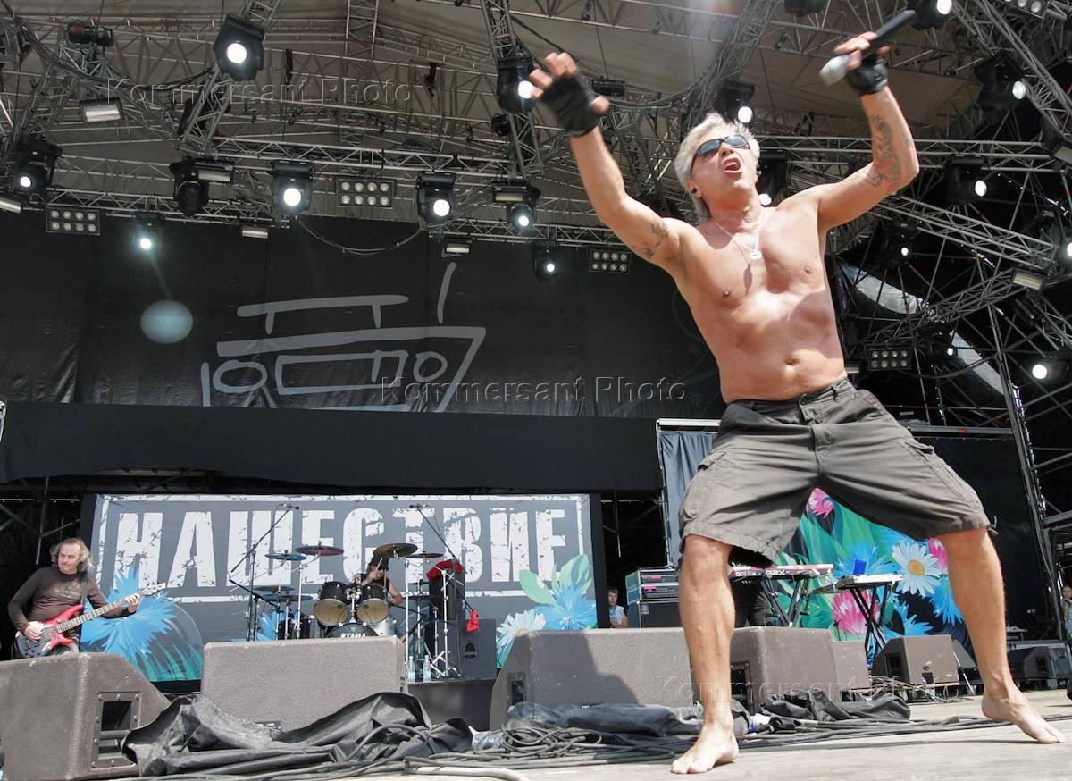 "Nashestvie 2009" rock festival took place in Bolshoe Zavidovo village in Tver region. Frontman of "Lyapis Trubetskoy" band Sergey Mikhalok.
