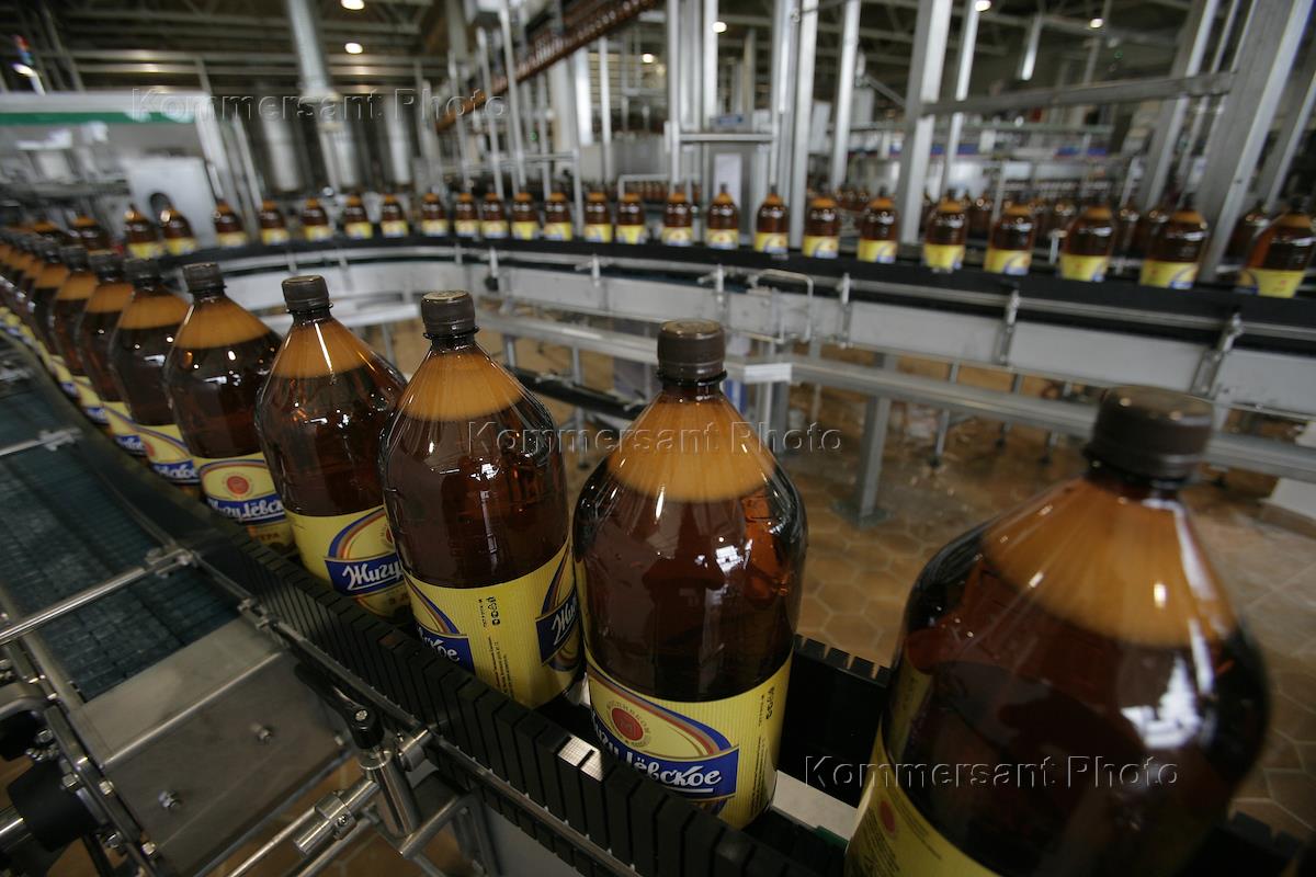 Цех завода "МПК" (Московская пивоваренная компания). Бутылки пива "Жигулевское" на конвейере.
