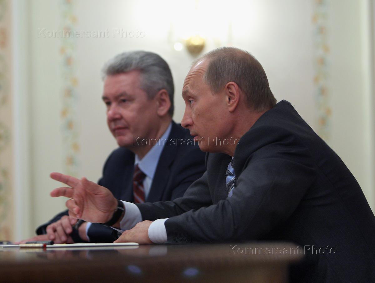 Russian Vice Premier Sergey Sobyanin, left, attends the meeting with Russian Prime Minister Vladimir Putin, right, in Novo Ogarevo residence.
