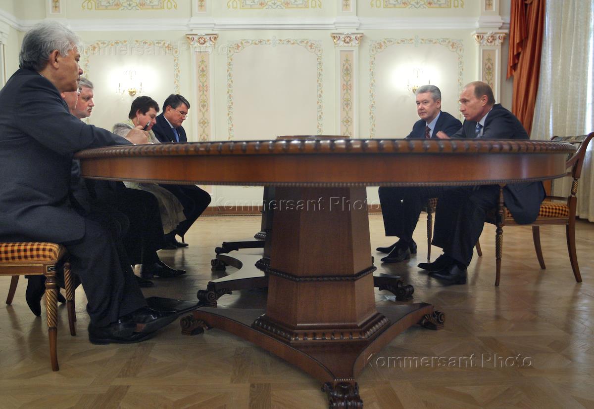 Left to right: Federation Council of Russia senator Mikhail Nikolayev (from Yakutia republic), Federation Council Deputy Head Alexander Torshin, Federation Council Head Sergey Mironov, Federation Council Deputy Head Svetlana Orlova, Federation Council of Russia senator Yury Vorobyev (from Volgograd oblast), Vice Premier Sergey Sobyanin and Russian Prime Minister Vladimir Putin at the meeting in Novo Ogarevo residence.