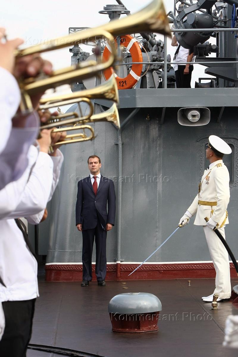 Russian President Dmitry Medvedev, left, visits guided missile cruiser Moskva in Novorossiysk Bay.