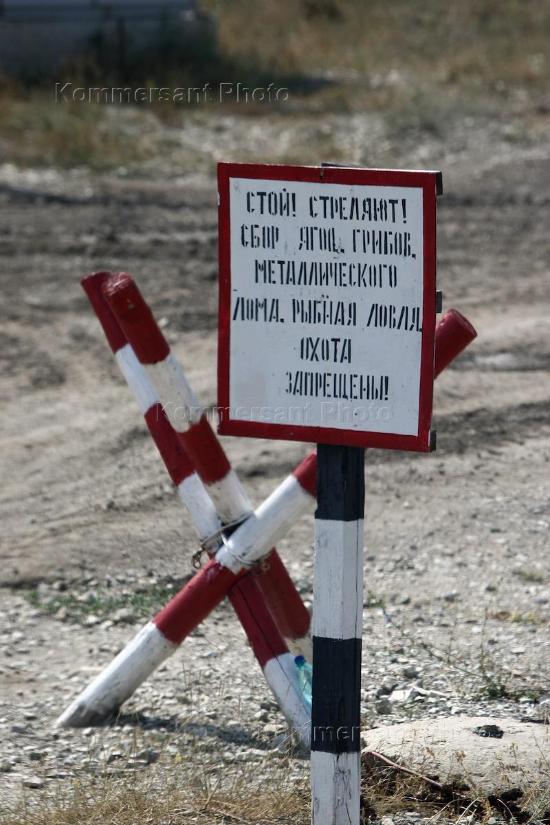Russian warships military base. The board "Stop! Shooting! Berries, mushrooms and scrap harvest, fishing and hunting is prohibited!"