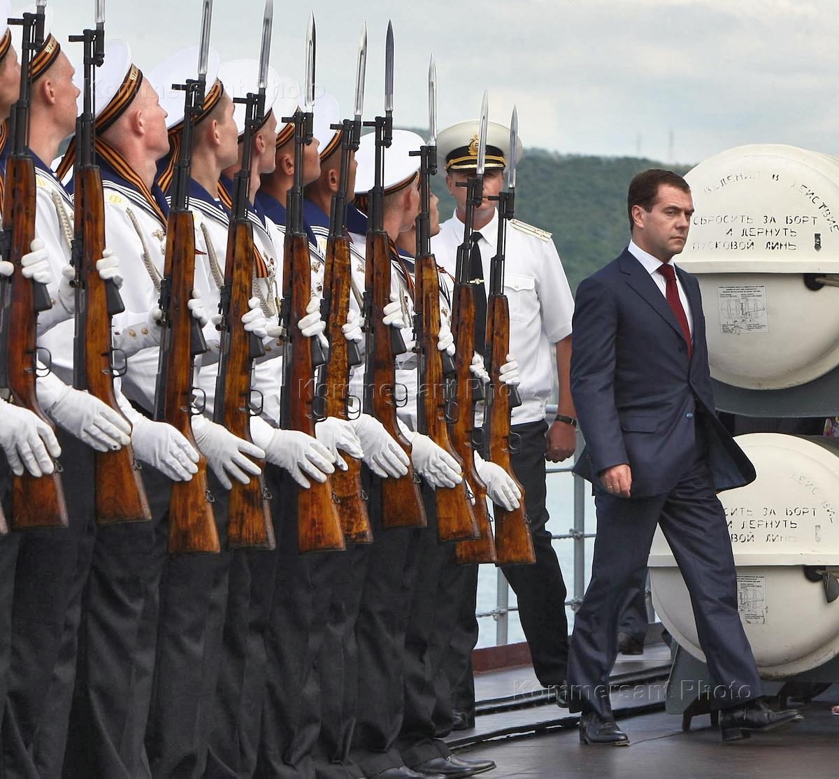 Russian President Dmitry Medvedev, left, visits guided missile cruiser Moskva in Novorossiysk Bay.
