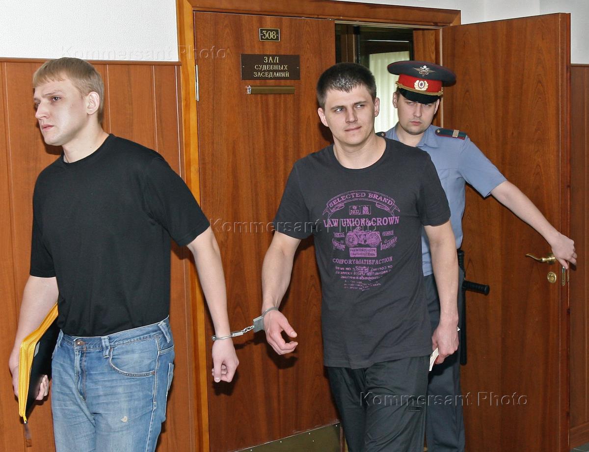Train police officers Vitaly Bormotov and Vladimir Lytkin charged with taking $250 000 bribe attend the sentencing in Moscow city court.