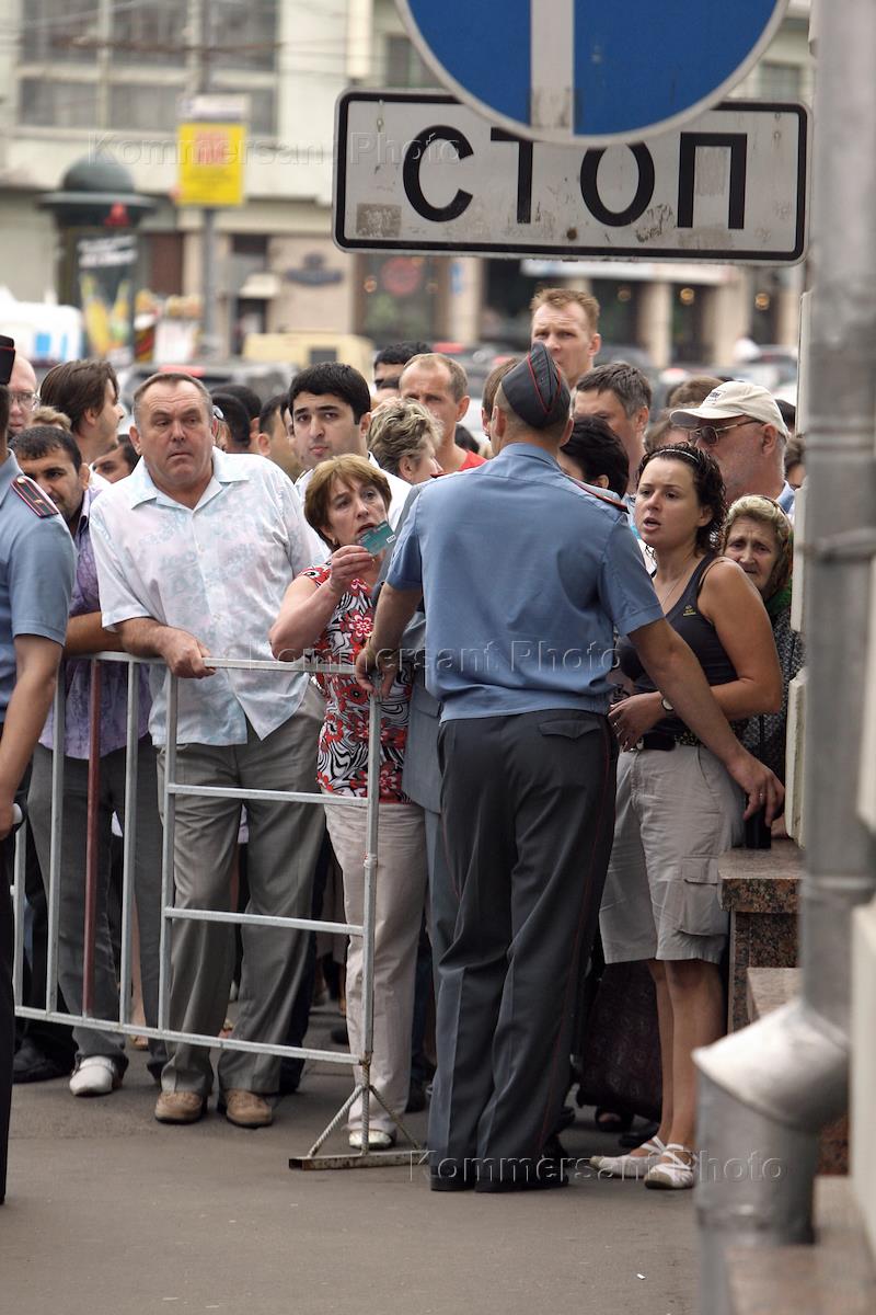 Жанровая фотография. Продавцы и арендаторы закрытого Черкизовского рынка у входа на территорию рынка возле торгового центра "Новочеркизовский". Территория рынка.