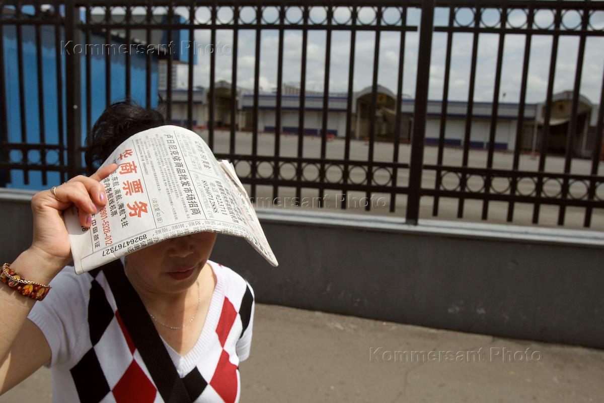 Genre photo. The seller from the Cherkizovskiy bazaar is walking along the bazaar fence while covering face from the sun with chineese newspaper.
