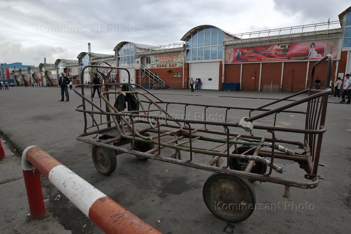Жанровая фотография. Тележка с товаром на территории закрытого Черкизовского рынка.