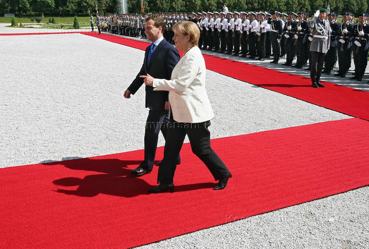 Russian President Dmitriy Medvedev, left, and German Chancellor Angela Merkel, right, during the meeting at the Schleissheim Palace's square.