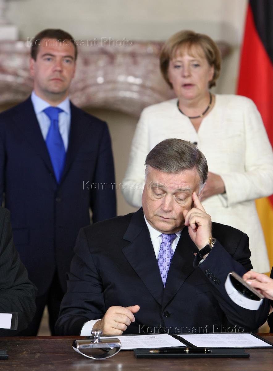 Left to right: member of the board of Siemens AG Siegfried Russwurm, Russian President Dmitry Medvedev, President of Russian Railways company Vladimir Yakunin, German Chancellor Angela Merkel and chairman of the board of Pipe Metallurgical company (TMK) Dmitry Pumpyansky sign agreements after the Russian-German talks in the Schleissheim Palace in Munich.