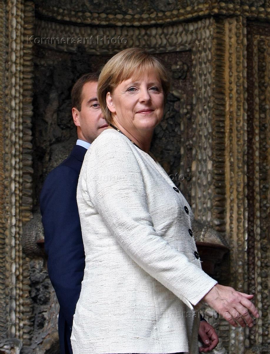 Russian President Dmitry Medvedev meets German Chancellor Angela Merkel at the Schleissheim Palace during his visit to Germany. Russian Railways CEO Vladimir Yakunin attends the meeting.