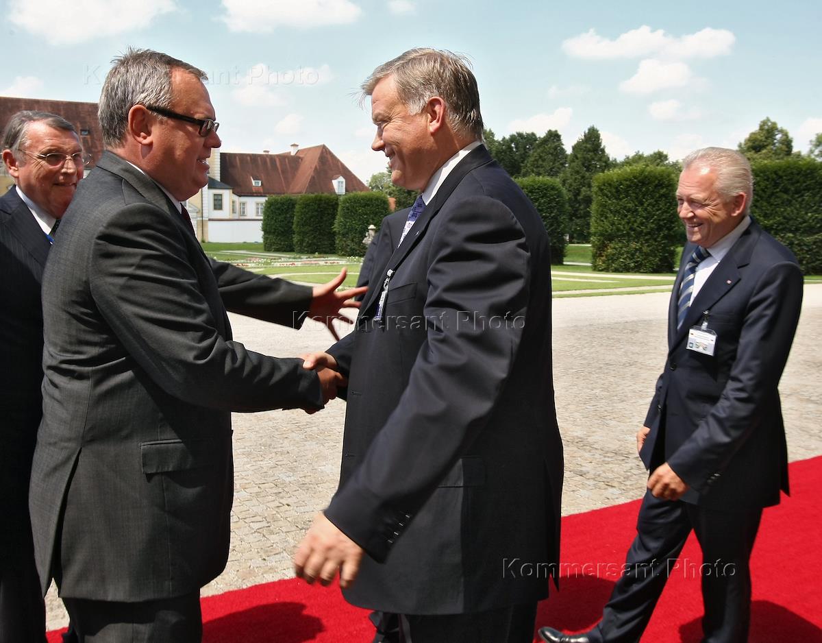 Рабочий визит президента России Дмитрия Медведева в Мюнхен. Министр промышленности и торговли России Виктор Христенко (слева) и министр образования и науки России Андрей Фурсенко (в центре) во время официальной церемонии встречи на парковой площади замка Шляйсхайм (Schleissheim).