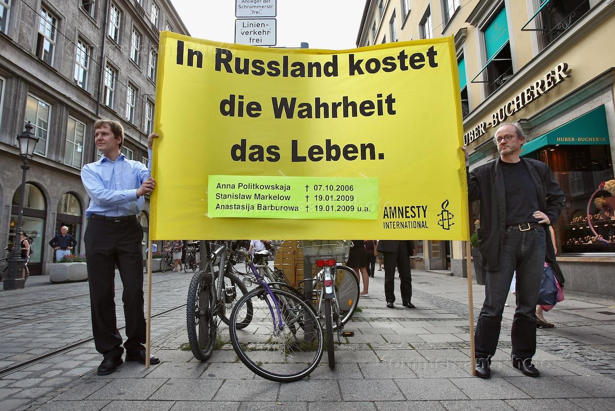 Пикет памяти правозащитницы Натальи Эстемировой прошел в Мюнхене во время визита президента России Дмитрия Медведева.