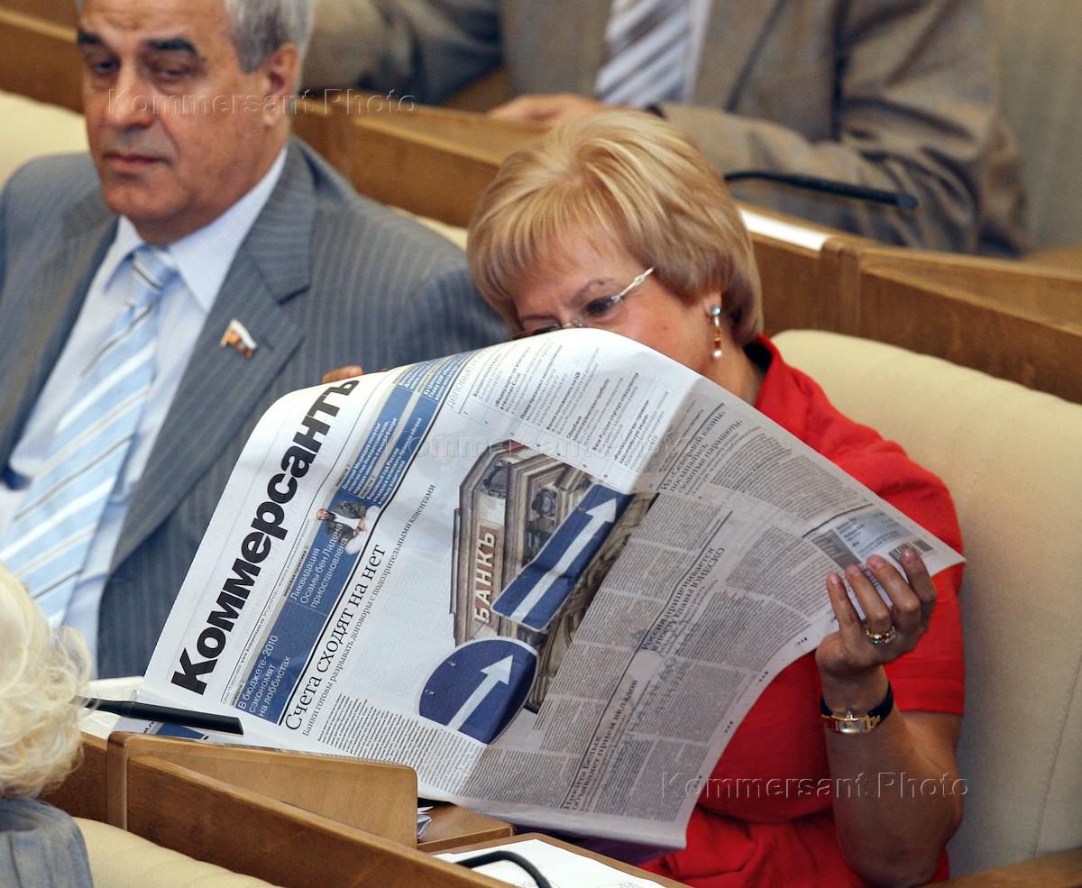 Lawmakers are reading "Kommersant" newspaper before the beginig of State Duma plenary meeting.