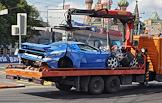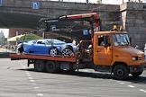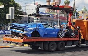Автомобильное шоу Bavaria Moscow City Racing прошло на Кремлевской набережной. Эвакуатор увозит разбитый автомобиль.