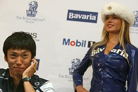 Японский гонщик Казуки Накаджима на пресс-конференции перед стартом автомобильного шоу Bavaria Moscow City Racing. Шоу прошло на Кремлевской набережной.