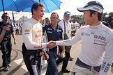 Гонщики Давид Кулхард (второй слева) и Казуки Накаджима (справа) после участия в автомобильном шоу Bavaria Moscow City Racing. Шоу прошло на Кремлевской набережной.