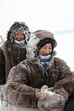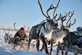 Жанровая фотография. Эвенки едут на санях в упряжке северных оленей.