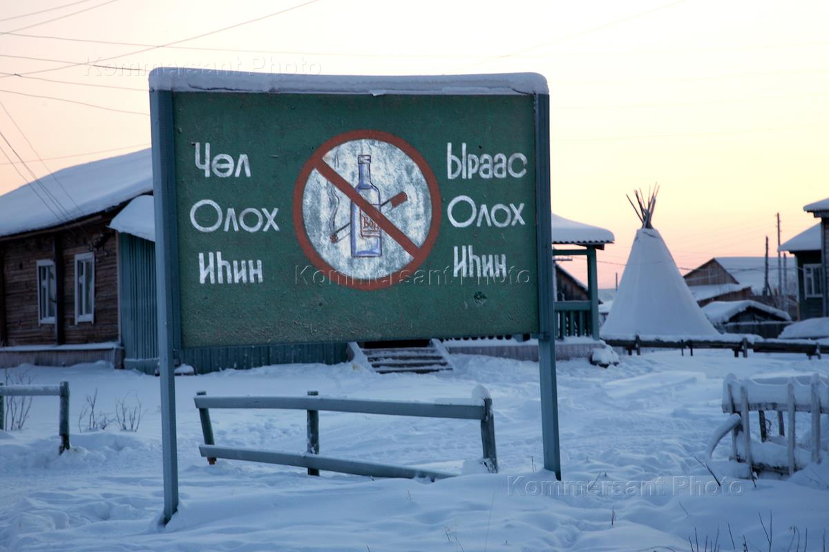 Рекламный щит о запрете курения и распития спиртных напитков на въезде в село Оленёк Оленекского района.