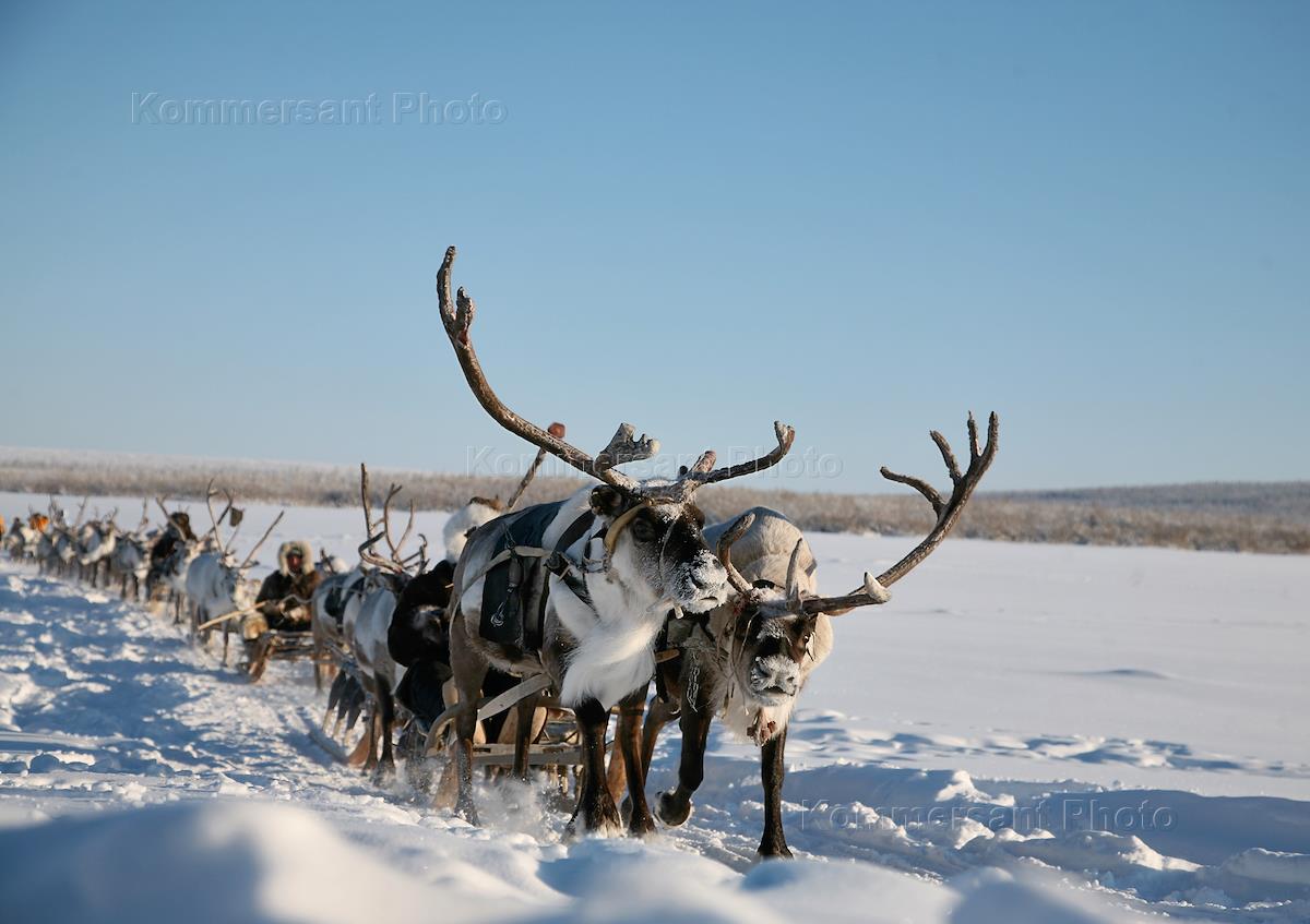 Виды Республики Саха (Якутия). Жанровая фотография. Северные олени в упряжке.