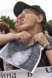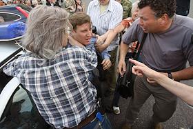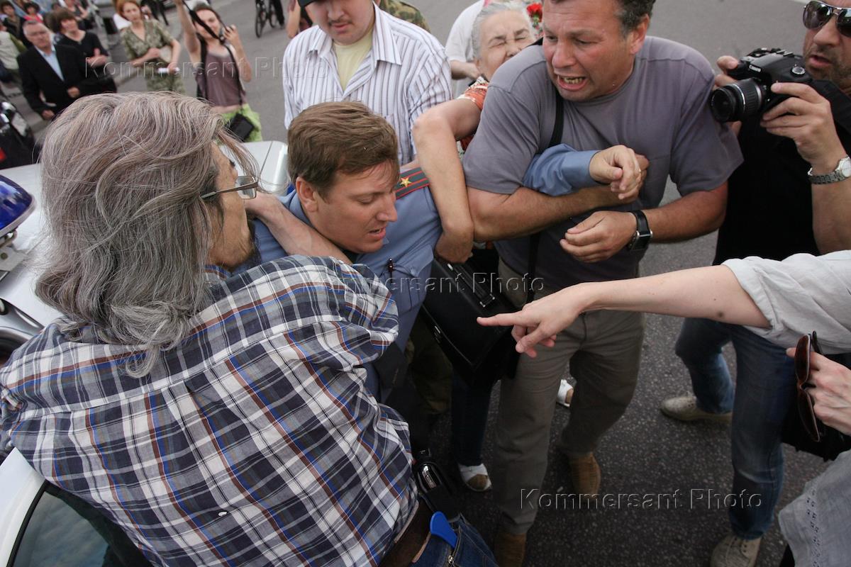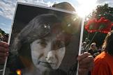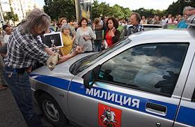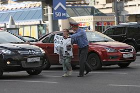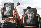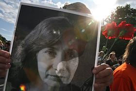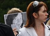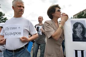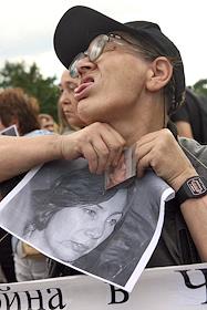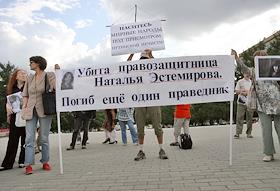 Акция памяти убитой правозащитницы Натальи Эстемировой прошла в Новопушкинском сквере. Плакат "Убита правозащитница Наталья Эстемирова. Погиб еще один праведник!".