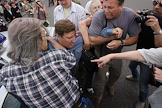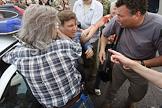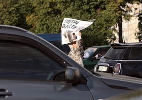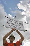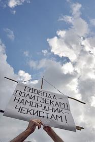 Акция памяти убитой правозащитницы Натальи Эстемировой прошла в Новопушкинском сквере. Плакат "Свобода - политзекам! Намордник - чекистам!".