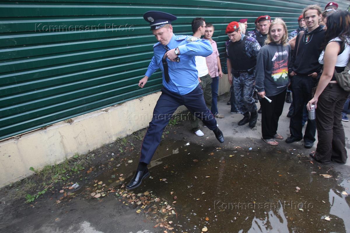 Во время акции протеста против визита Патриарха Московского и всея Руси Кирилла в Украину, организованная активистами общественной организации "Украинская национальная ассамблея - Украинская народная самооборона" (УНА-УНСО) и партии "Свобода". Офицер МВД перепрыгивает через лужу.