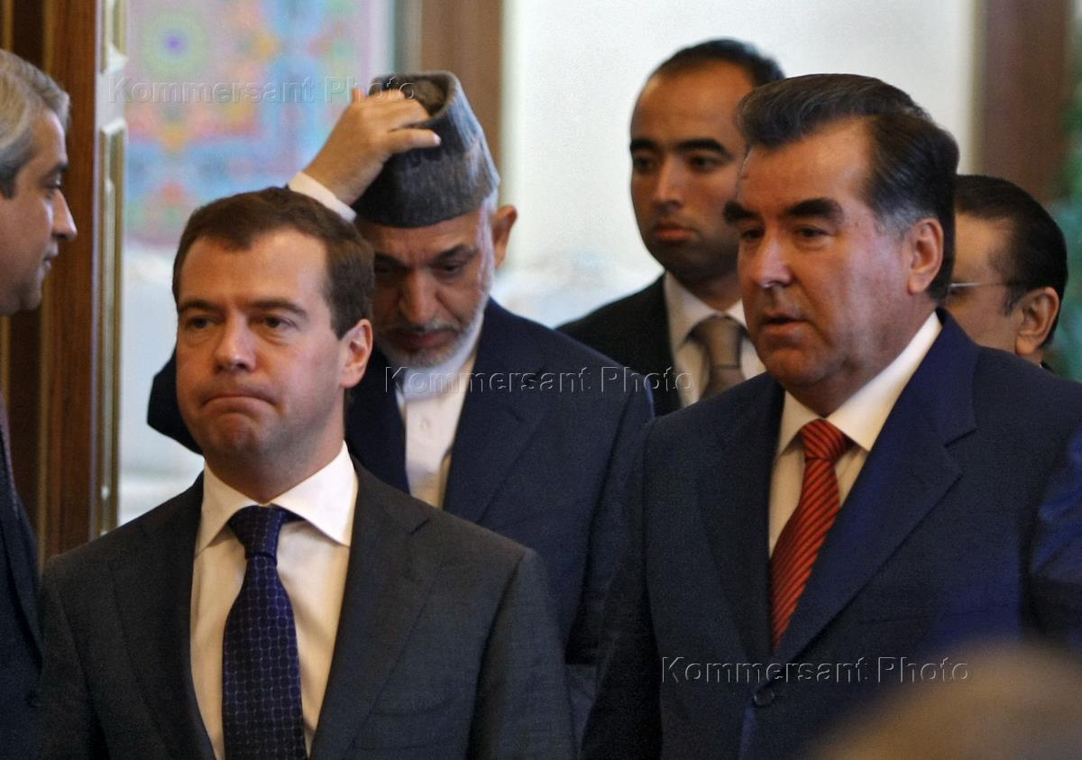 Слева направо: президент Таджикистана Эмомали Рахмон, президент России Дмитрий Медведев и президент Афганистана Хамид Карзай во время четырёхсторонней встречи президентов России, Таджикистана, Афганистана и Пакистана.