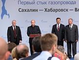 Слева направо: заместитель председателя правления ОАО "Газпром" Александр Ананенков, председатель правительства России Владимир Путин, министр энергетики России Сергей Шматко и полномочный представитель президента России в Дальневосточном федеральном округе (ДФО) Виктор Ишаев во время торжественной церемонии начала строительства магистрального газопровода "Сахалин - Хабаровск - Владивосток".