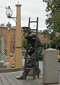 Образцы городской скульптуры Санкт-Петербурга. Памятник "Фонарщику" на Одесской улице установленный напротив дома где в 1871 году находилась мастерская изобретателя А. Н. Лодыгина, где создавались первые осветительные приборы, электрические лампы и первый фонарь, который зажгли на этом месте 11 сентября 1873 года.