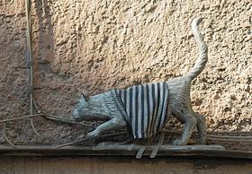 Образцы городской скульптуры Санкт-Петербурга. Памятник "Кошке в тельняшке", который в связи с переездом петербургского творческого центра "Митьки" теперь находится на уровне второго этажа дома № 36 по улице Марата.