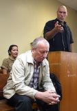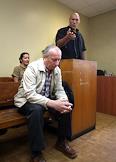 Охранник спорткомплекса "Спартак" Юрий Сергеев (в центре) и боксер Николай Валуев (слева) с женой Галиной (справа) на заседании Калининского федерального суда. Николая Валуева обвиняется в причинении легкого вреда здоровью охранника СК "Спартак" Юрия Сергеева.