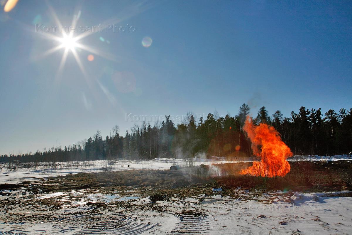 Жанровая фотография. Газовое месторождение. Огненный факел из земли.