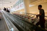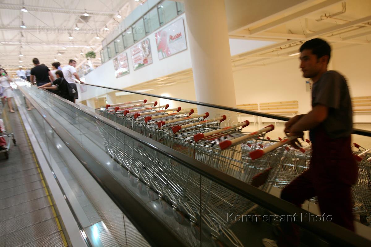 Торговый центр "Мега", "Ашан". Сотрудник гипермакета "Ашан" везет продуктовые тележки по эскалатору.