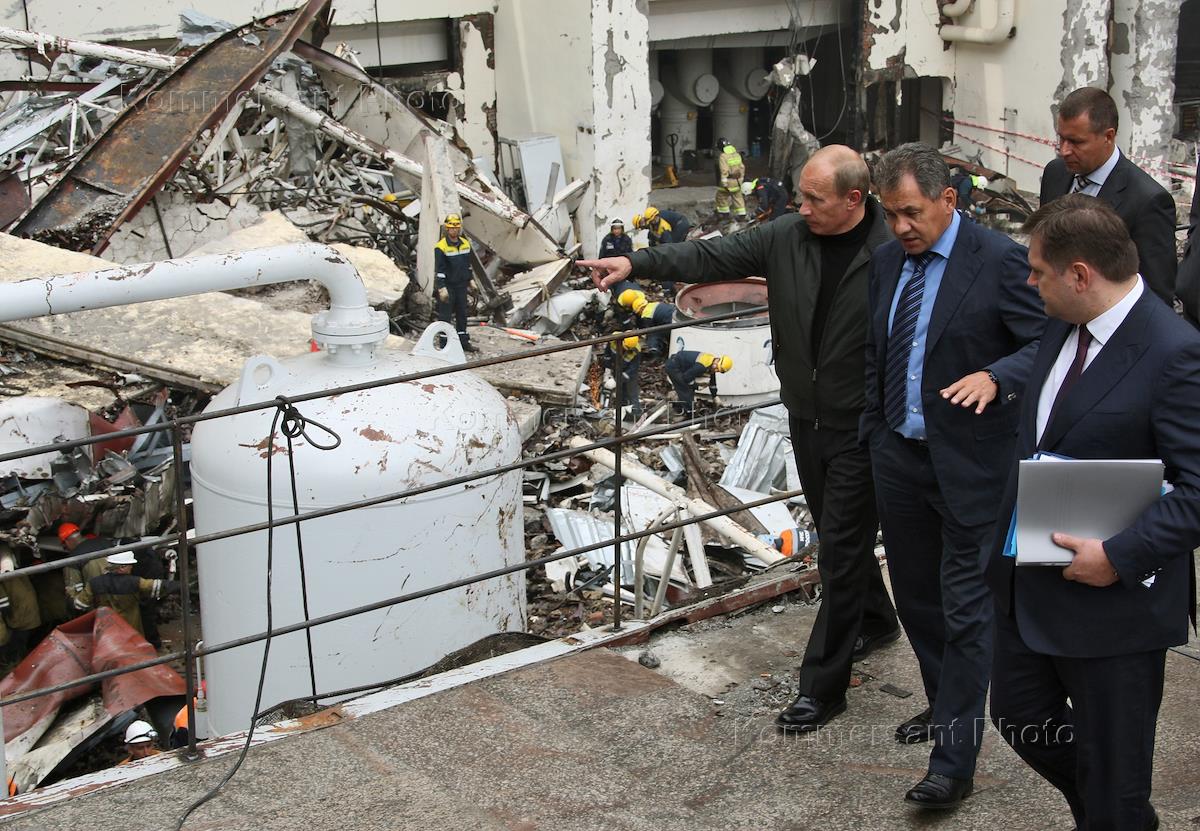 Слева направо: министр России по делам гражданской обороны, чрезвычайным ситуациям и ликвидации последствий стихийных бедствий Сергей Шойгу, председатель правительства России Владимир Путин и министр энергетики России Сергей Шматко на территории Саяно-Шушенской гидроэлектростанции (ГЭС), где произошла авария.