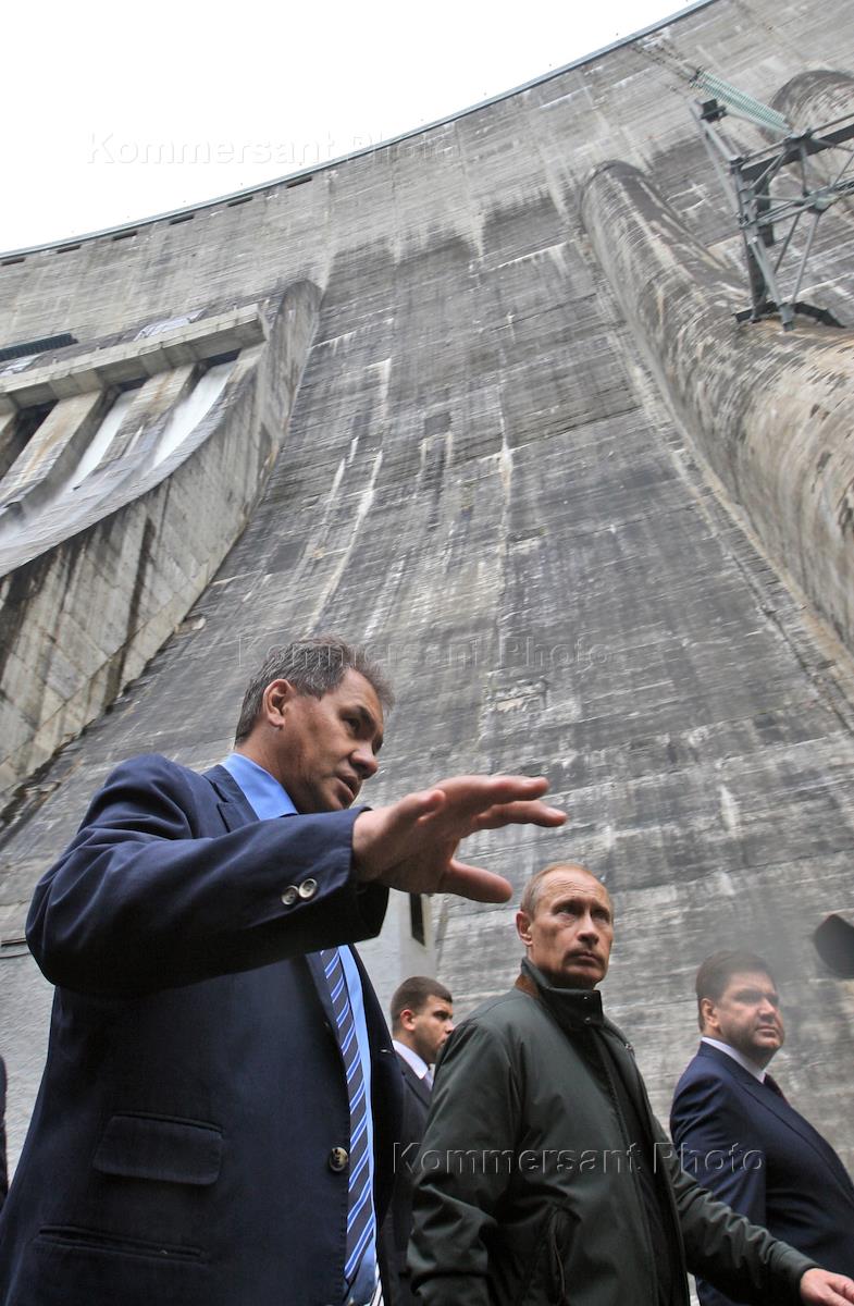 Слева направо: председатель правительства России Владимир Путин, министр России по делам гражданской обороны, чрезвычайным ситуациям и ликвидации последствий стихийных бедствий Сергей Шойгу и министр энергетики России Сергей Шматко на территории Саяно-Шушенской Гидроэлектростанции (ГЭС), где произошла авария.