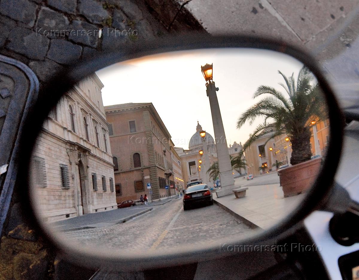 Собор Святого Петра отражается в зеркале мотоцикла.