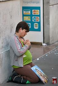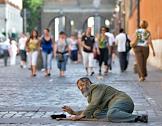 Нищий просит милостыню на улице Via di Porta Angelica в Риме.