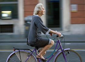 Жанровая фотография. Пожилая женщина едет на велосипеде.
