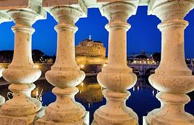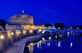 Виды ночного Рима. Замок Святого Ангела на берегу реки Тибр.