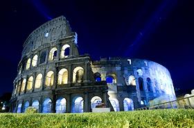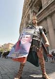 Жанровая фотография. Человек в костюме гладиатора с афишей финала Лиги чемпионов - 2009 и портретом Криштиану Роналду у здания Колизея в Риме.