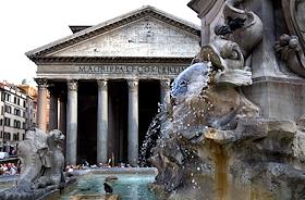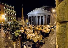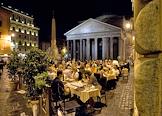 Виды вечернего Рима. Посетители за столиками на летней площадке ресторана на площади перед Пантеоном.