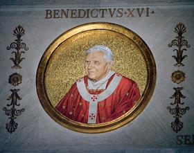 Внутреннее убранство базилики Сан Паоло Фуори ле Мура. Мозаичный портрет Папы Римского Бенедикта XVI.