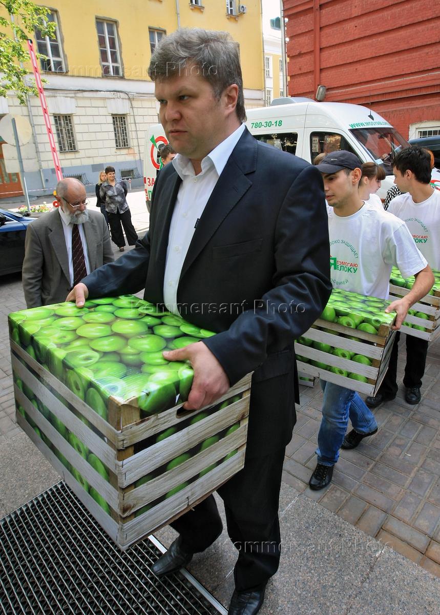 Председатель Российской объединенной демократической партии "Яблоко" Сергей Митрохин (в центре) во время сдачи подписей избирателей в поддержку выдвижения списка кандидатов от политической партии "Яблоко" в депутаты Московской городской думы в городскую избирательную комиссию.
