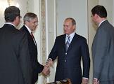 Президент Европейского банка реконструкции и развития (ЕБРР) Томас Миров (второй слева) и председатель правительства России Владимир Путин (второй справа) во время официальной встречи в Ново-Огарево.