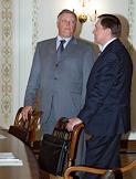 Президент ОАО "Российские железные дороги" (РЖД) Владимир Якунин (слева) и заместитель руководителя аппарата правительства России Юрий Ушаков (справа) на официальной встрече президента Европейского банка реконструкции и развития (ЕБРР) Томаса Мирова и председателя правительства России Владимира Путина. Встреча прошла в Ново-Огарево.