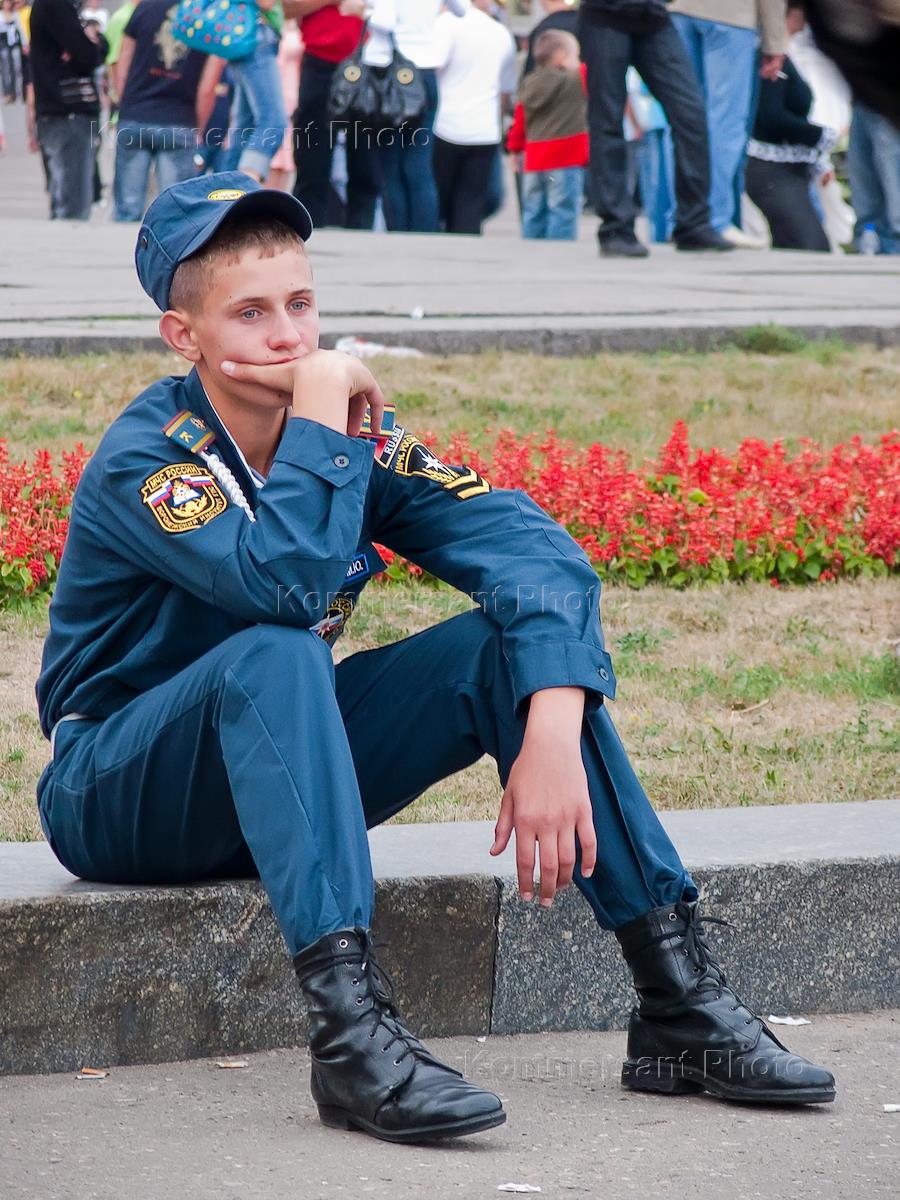 Жанровая фотография. Курсант "Воронежского института Государственной противопожарной службы МЧС России" сидит на гранитном бордюре.