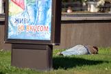 Жанровая фотография. Празднование Дня города. Молодой человек лежит на газоне у рекламного стенда "Живи со вкусом!".
