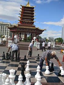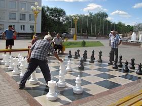 Местные жители играют в большие шахматы на центральной площади города Элиста.