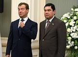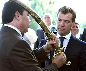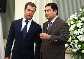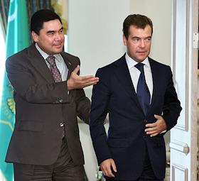 Президент России Дмитрий Медведев (слева) и президент Туркменистана Гурбангулы Бердымухамедов (справа) во время встречи в резиденции туркменского президента на берегу Каспийского моря.